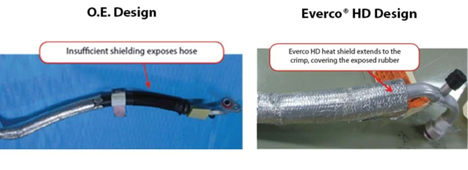 Everco HD started by upgrading the hose to a barrier grade (SAE J3062 - type C, class 1 (G4890-14) which is designed for zero-permeation. Engineering analysis found the O.E. suction hose was a non-barrier, all rubber style prone to leaking and ultimately failure. Extending the heat shield the full length of the hose minimizes exposure to heat radiating from the close proximity to the exhaust manifold.