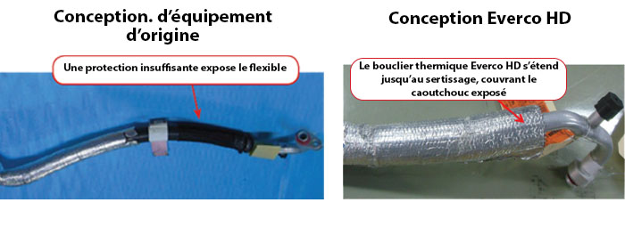 Everco HD a commencé par améliorer le flexible en le faisant passer à un niveau barrière (SAE J3062 – type C, classe 1 [G4890-14]) qui est conçu pour une perméation nulle. L’analyse technique a révélé que le flexible d’aspiration de l’équipement d’origine était un modèle sans barrière, tout en caoutchouc, sujet à des fuites et à des défaillances. L’extension du bouclier thermique sur toute la longueur du flexible minimise l’exposition à la chaleur rayonnant à proximité du collecteur d’échappement.