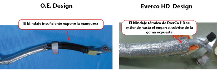 Everco HD comenzó por actualizar la manguera a un grado de barrera (SAE J3062 - tipo C, clase 1 (G4890-14) que está diseñado para una permeabilidad cero. El análisis de ingeniería determinó que la manguera de aspiración del equipo original era una manguera sin barrera, totalmente de goma, propensa a tener fugas y, en última instancia, a fallar. La extensión del escudo térmico en toda la longitud de la manguera minimiza la exposición al calor que irradia la proximidad del múltiple de escape.